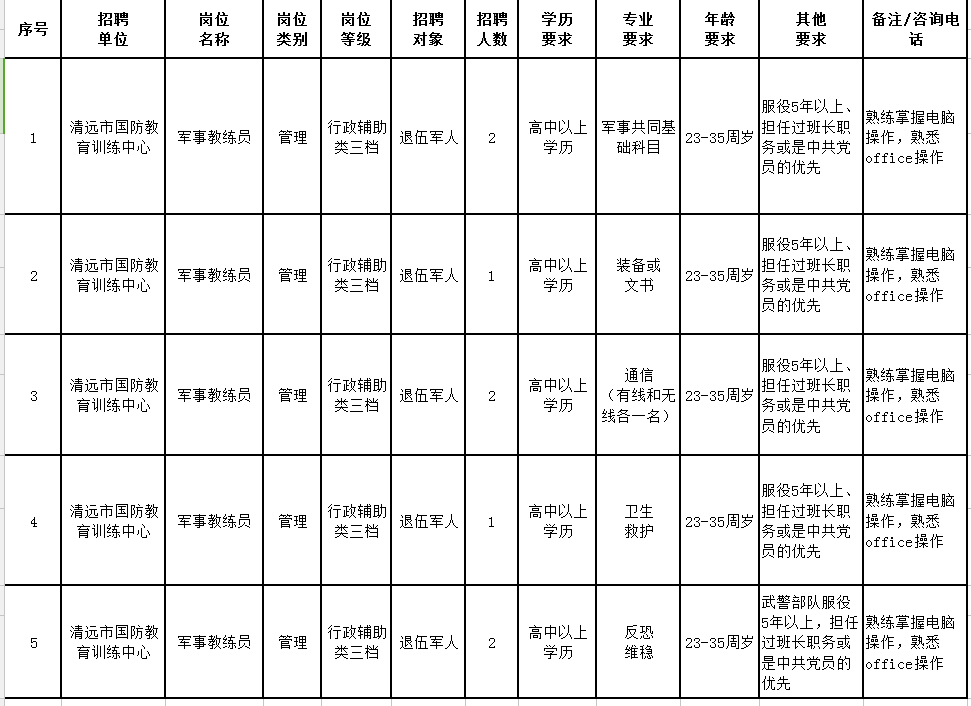 根據(jù)清遠(yuǎn)市國(guó)防訓(xùn)練中心工作需要,按照公平、公開、公正、擇優(yōu)的原則,我中心面向社會(huì)公開招聘8名工作人員(軍事訓(xùn)練教官,非政府雇員,非行政事業(yè)編制人員,不列入用人單位編制序列,不擔(dān)任行政職務(wù)),現(xiàn)將有關(guān)事項(xiàng)公告如下:
